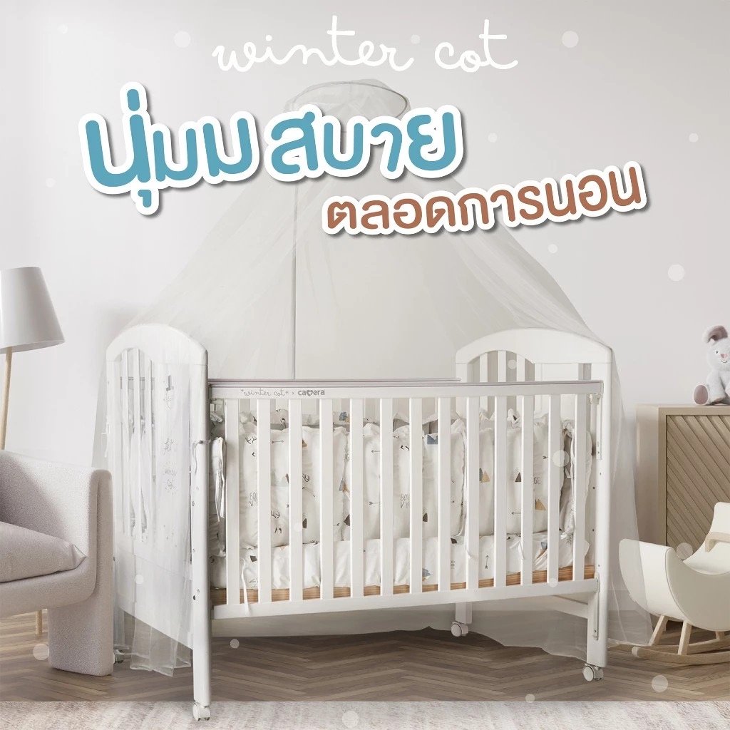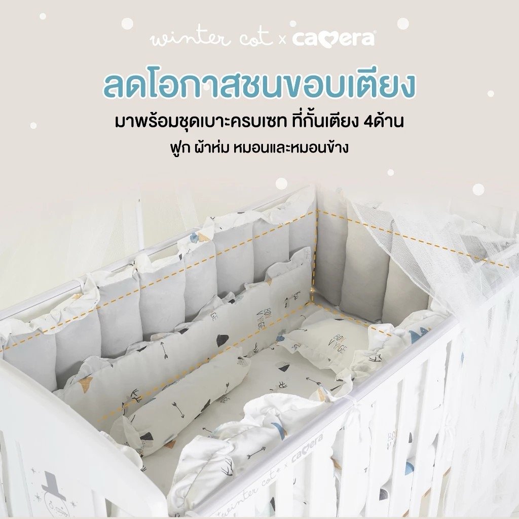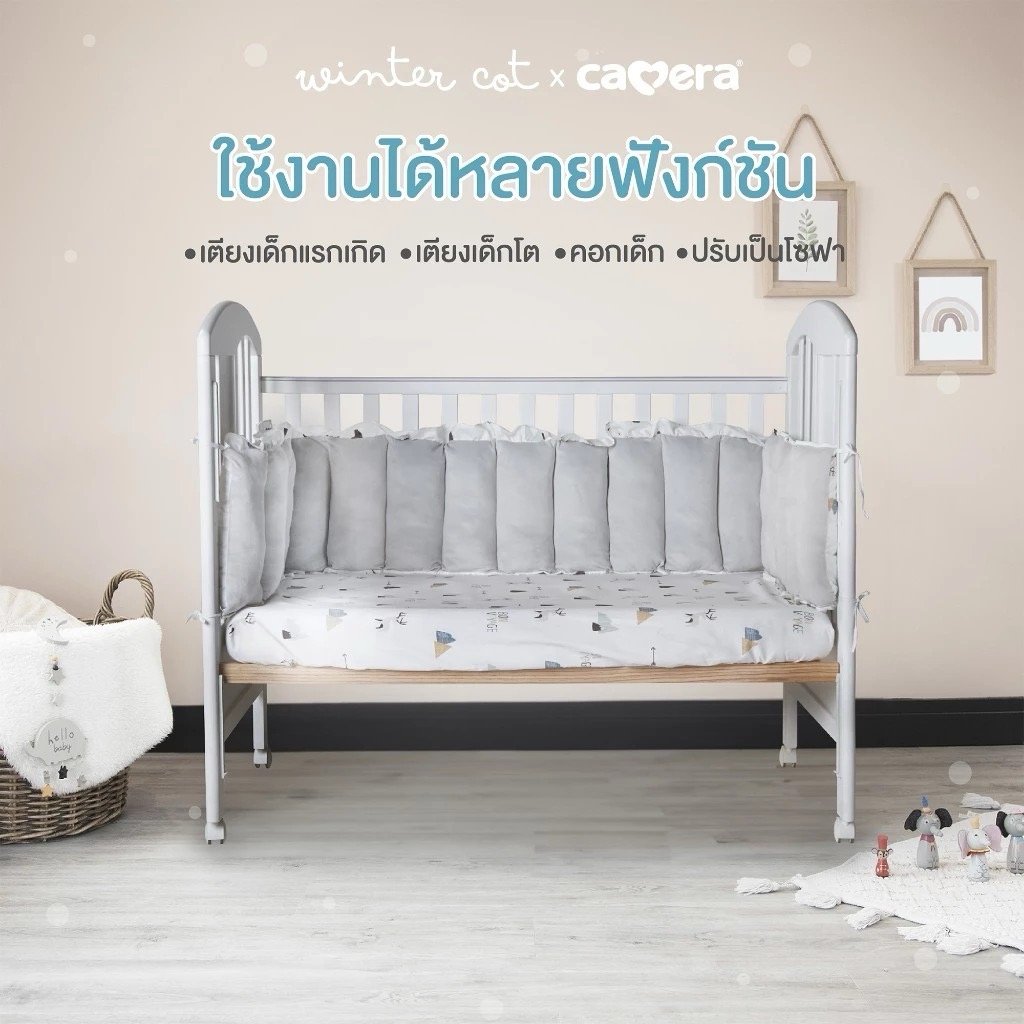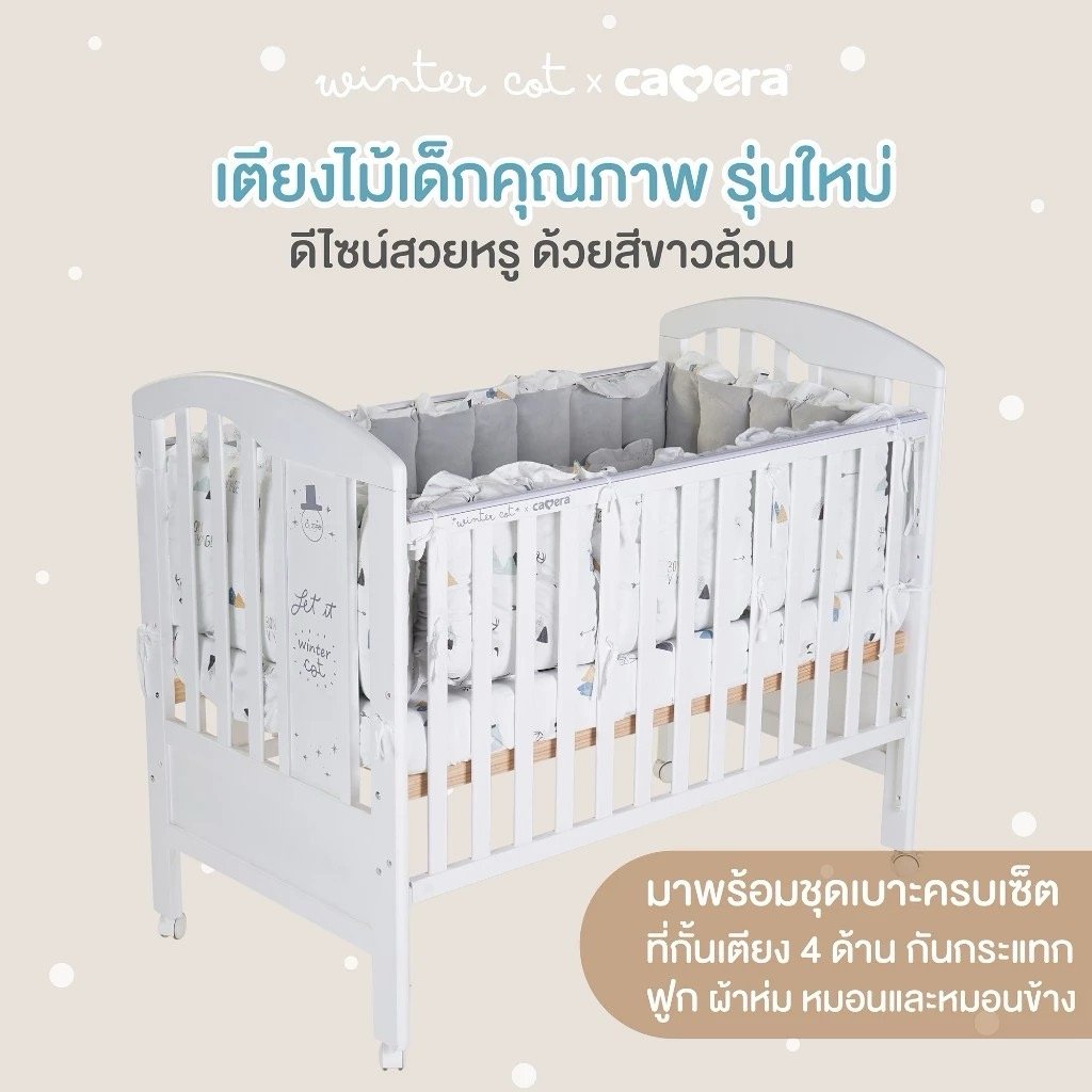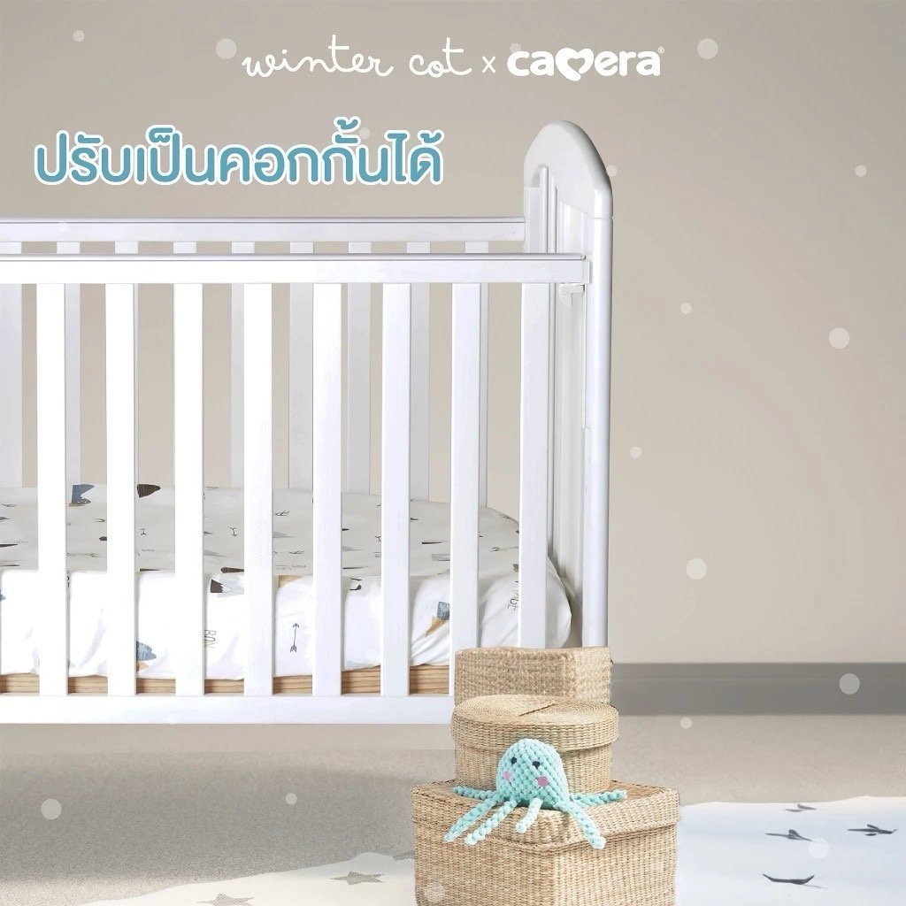 เตียงไม้เด็กสีขาวมินิมอล ยี่ห้อ CAMERA แถมอุปกรณ์ที่นอนครบเซ็ท มุ้งกระโจม เบาะที่นอน หมอน ผ้านวม ทำจาก COTTON ขนาด 70x130x10 cm.