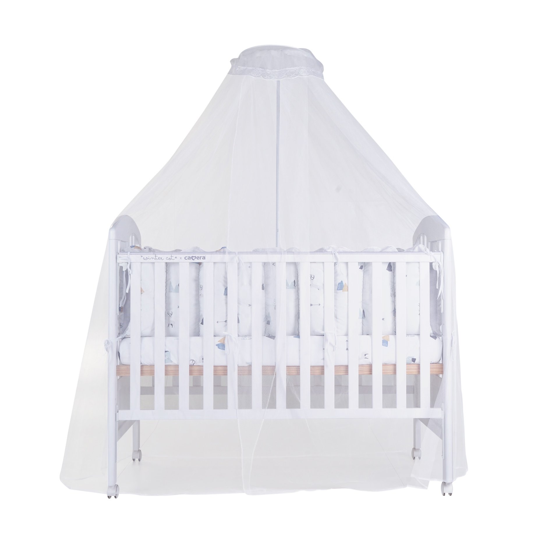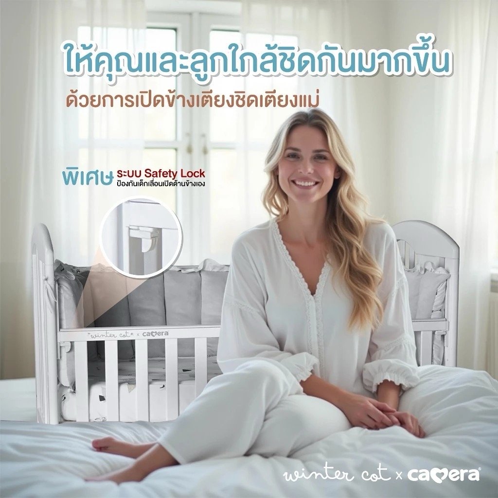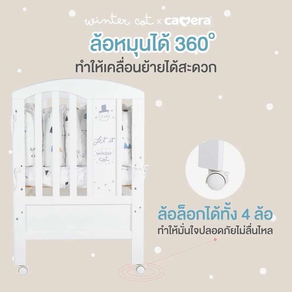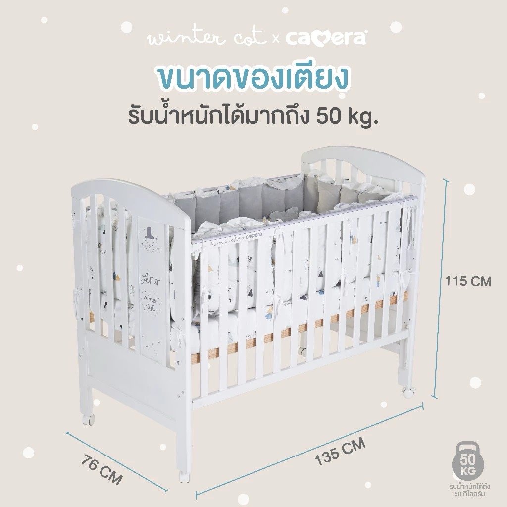 เตียงไม้เด็กสีขาวมินิมอล ยี่ห้อ CAMERA แถมอุปกรณ์ที่นอนครบเซ็ท มุ้งกระโจม เบาะที่นอน หมอน ผ้านวม ทำจาก COTTON ขนาด 70x130x10 cm.