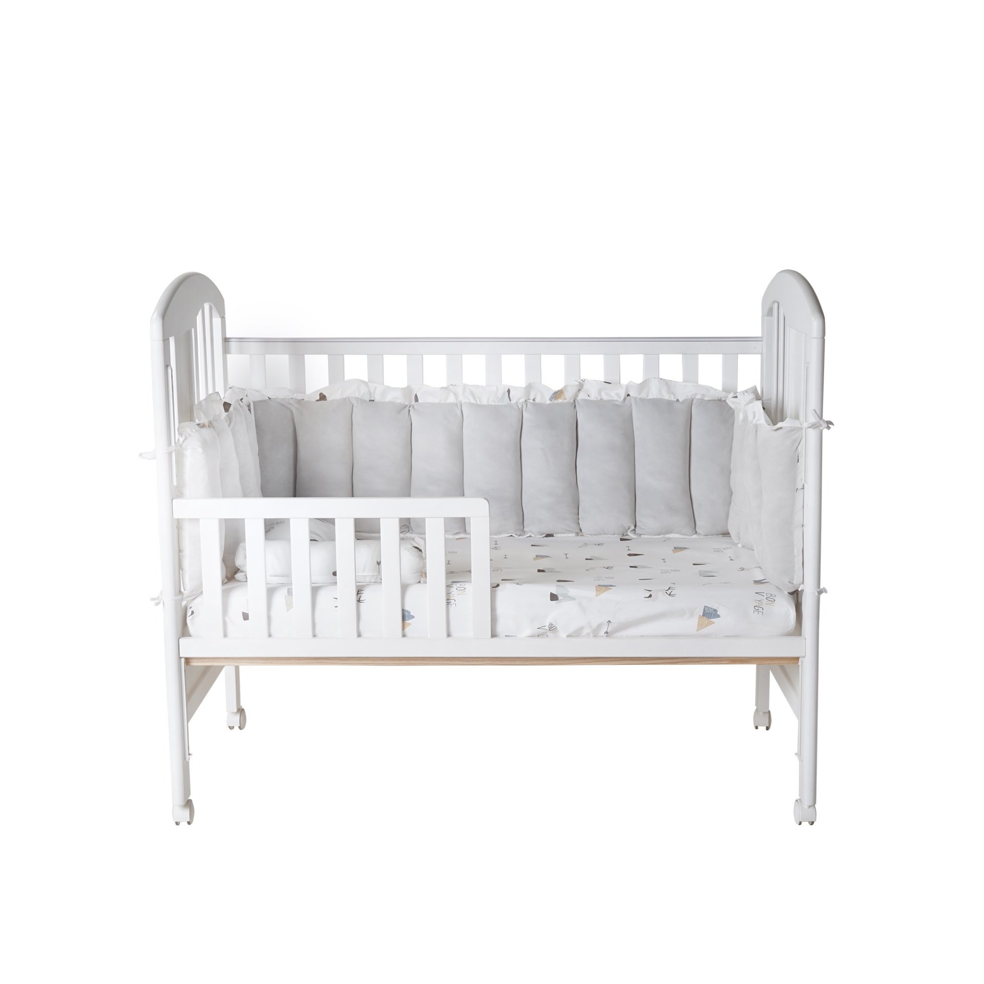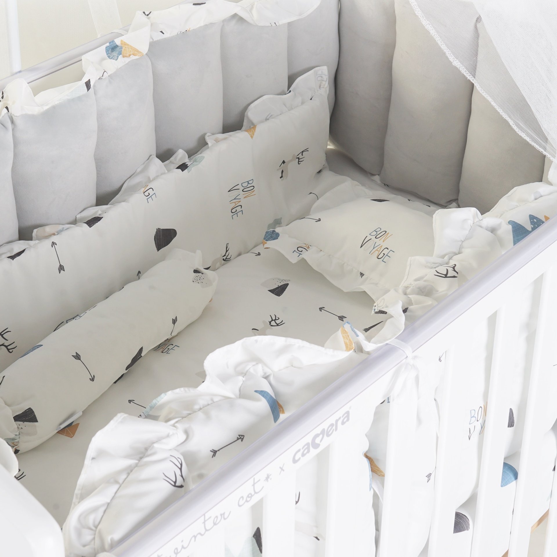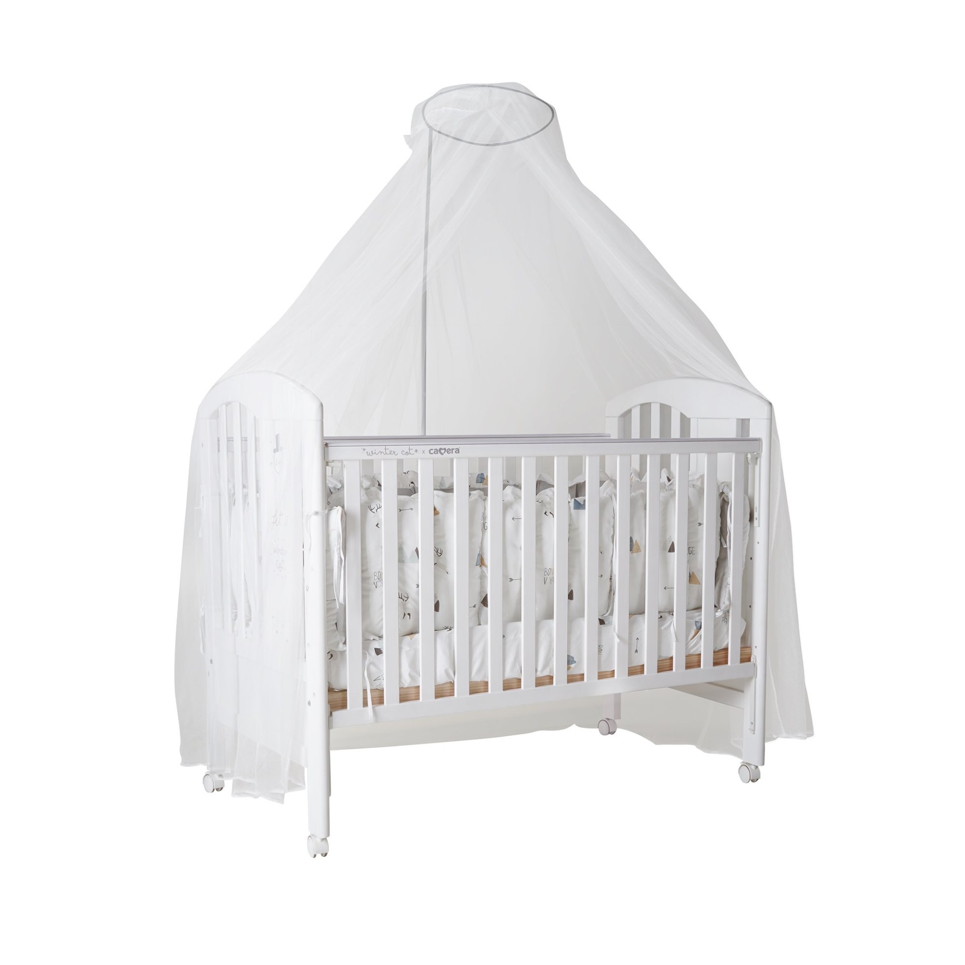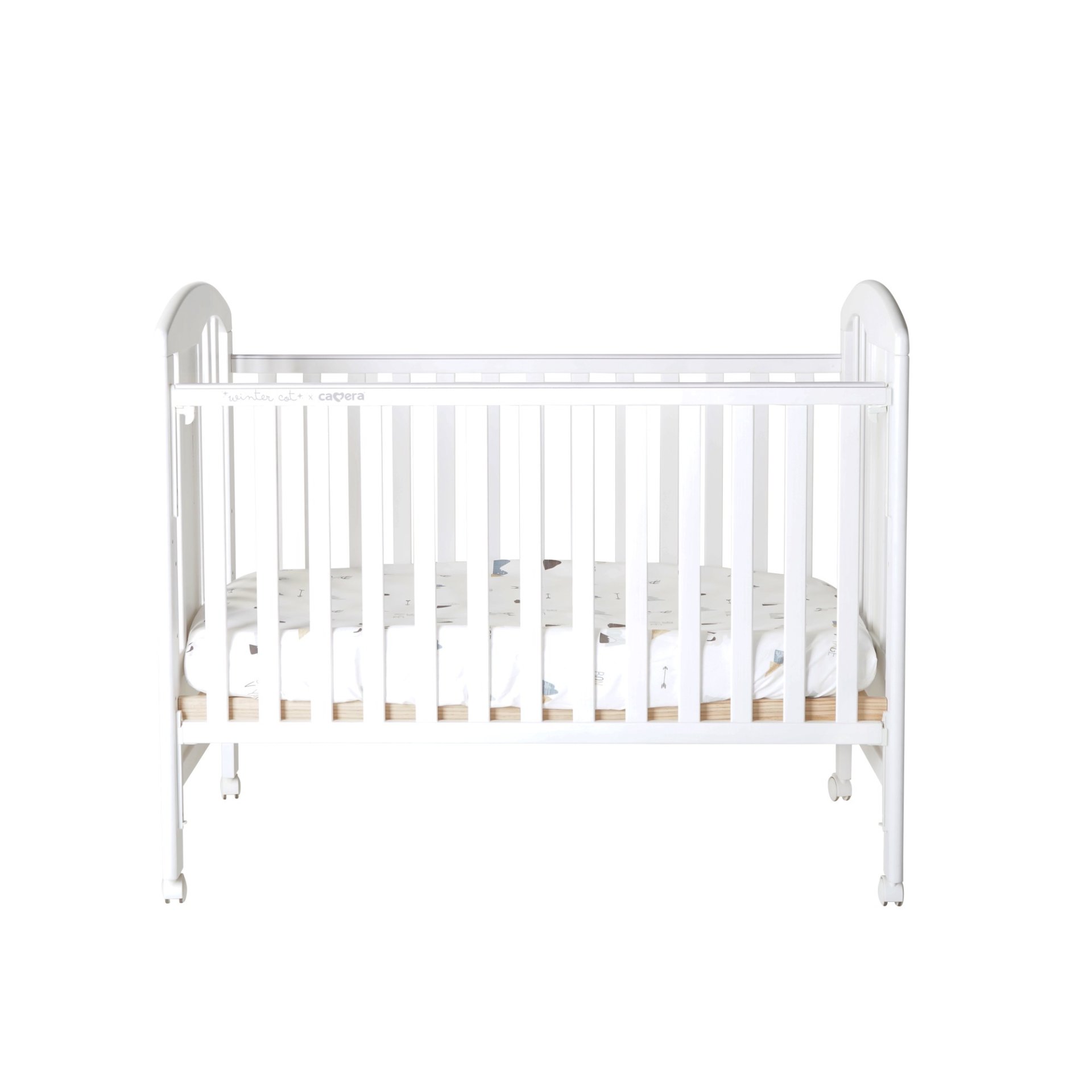 เตียงไม้เด็กสีขาวมินิมอล ยี่ห้อ CAMERA แถมอุปกรณ์ที่นอนครบเซ็ท มุ้งกระโจม เบาะที่นอน หมอน ผ้านวม ทำจาก COTTON ขนาด 70x130x10 cm.